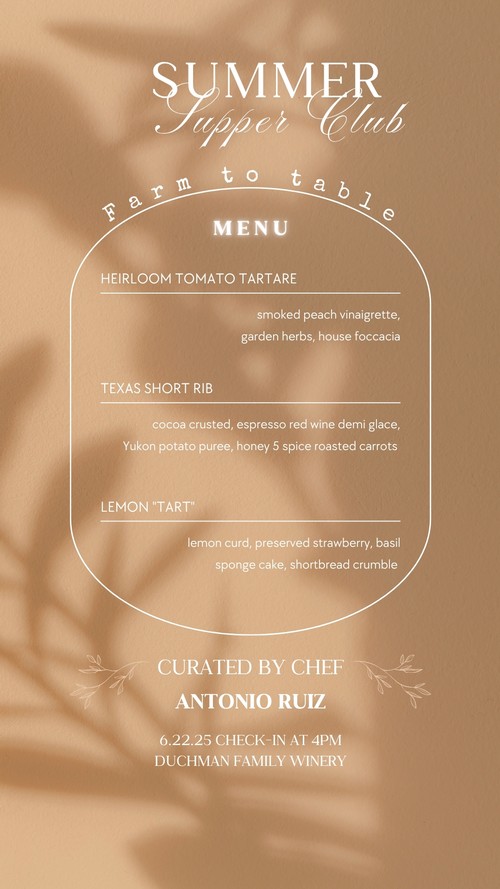 Welcome to the Summer Supper Club, a new event series highlighting the talents of our very own Chef Antonio Ruiz. Join us for a delightful evening at Duchman Family Winery where we will be showcasing creativity through the freshest local ingredients straight from the farm to your table.